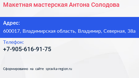Макетная мастерская Антона Солодова по адресу 600017, Владимирская область, Владимир, Северная, 38а в дальнейшем Организация, размещена в следующих категориях: