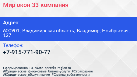 Мир окон 33, компания по адресу 600901, Владимирская область, Владимир, Ноябрьская, 127 в дальнейшем Организация, размещена в следующих категориях: