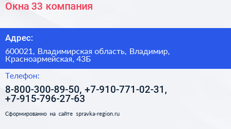 Окна 33, компания по адресу 600021, Владимирская область, Владимир, Красноармейская, 43Б в дальнейшем Организация, размещена в следующих категориях: