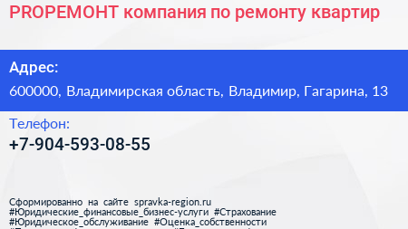 PROРЕМОНТ, компания по ремонту квартир по адресу 600000, Владимирская область, Владимир, Гагарина, 13 в дальнейшем Организация, размещена в следующих категориях: