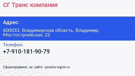 СГ-Транс, компания по адресу 600033, Владимирская область, Владимир, Мостостроевская, 22 в дальнейшем Организация, размещена в следующих категориях:
