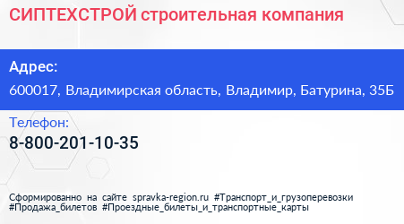 СИПТЕХСТРОЙ, строительная компания по адресу 600017, Владимирская область, Владимир, Батурина, 35Б в дальнейшем Организация, размещена в следующих категориях: