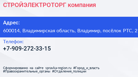 СТРОЙЭЛЕКТРОТОРГ, компания по адресу 600014, Владимирская область, Владимир, посёлок РТС, 2 в дальнейшем Организация, размещена в следующих категориях: