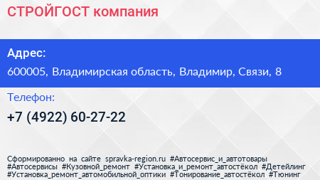СТРОЙГОСТ, компания по адресу 600005, Владимирская область, Владимир, Связи, 8 в дальнейшем Организация, размещена в следующих категориях: