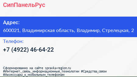 СипПанельРус по адресу 600021, Владимирская область, Владимир, Стрелецкая, 2 в дальнейшем Организация, размещена в следующих категориях: