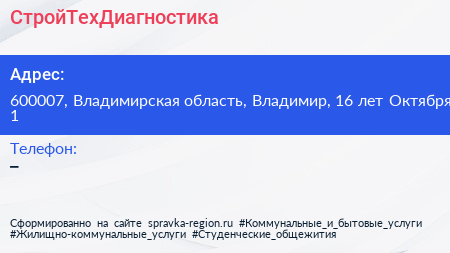 СтройТехДиагностика по адресу 600007, Владимирская область, Владимир, 16 лет Октября, 1 в дальнейшем Организация, размещена в следующих категориях: