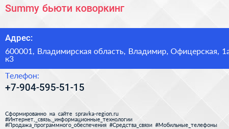Summy, бьюти-коворкинг по адресу 600001, Владимирская область, Владимир, Офицерская, 1а к3 в дальнейшем Организация, размещена в следующих категориях: