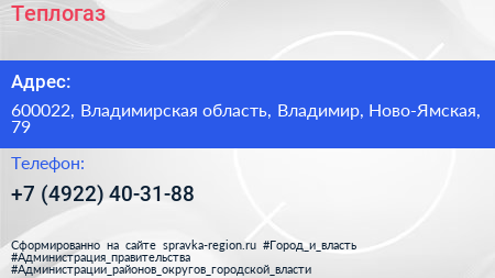 Теплогаз по адресу 600022, Владимирская область, Владимир, Ново-Ямская, 79 в дальнейшем Организация, размещена в следующих категориях: