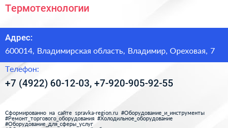 Термотехнологии по адресу 600014, Владимирская область, Владимир, Ореховая, 7 в дальнейшем Организация, размещена в следующих категориях: