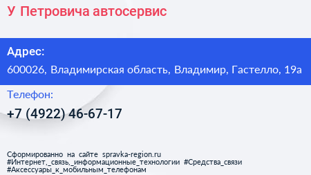 У Петровича, автосервис по адресу 600026, Владимирская область, Владимир, Гастелло, 19а в дальнейшем Организация, размещена в следующих категориях: