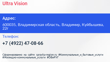Ultra Vision по адресу 600035, Владимирская область, Владимир, Куйбышева, 22г в дальнейшем Организация, размещена в следующих категориях: