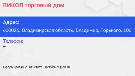 ВИКОЛ, торговый дом по адресу 600026, Владимирская область, Владимир, Горького, 106 в дальнейшем Организация, размещена в следующих категориях: