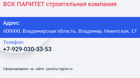 ВСК-ПАРИТЕТ, строительная компания по адресу 600000, Владимирская область, Владимир, Никитская, 17 в дальнейшем Организация, размещена в следующих категориях:
