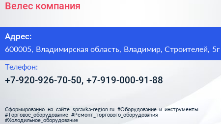 Велес, компания по адресу 600005, Владимирская область, Владимир, Строителей, 5г в дальнейшем Организация, размещена в следующих категориях: