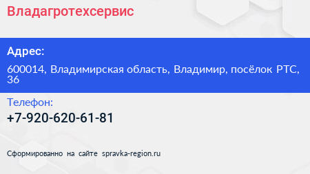 Владагротехсервис по адресу 600014, Владимирская область, Владимир, посёлок РТС, 36 в дальнейшем Организация, размещена в следующих категориях: