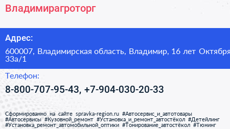 Владимирагроторг по адресу 600007, Владимирская область, Владимир, 16 лет Октября, 33а/1 в дальнейшем Организация, размещена в следующих категориях: