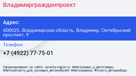 Владимиргражданпроект по адресу 600025, Владимирская область, Владимир, Октябрьский проспект, 9 в дальнейшем Организация, размещена в следующих категориях: