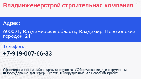 Владинженерстрой, строительная компания по адресу 600021, Владимирская область, Владимир, Перекопский городок, 24 в дальнейшем Организация, размещена в следующих категориях: