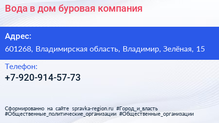 Вода в дом, буровая компания по адресу 601268, Владимирская область, Владимир, Зелёная, 15 в дальнейшем Организация, размещена в следующих категориях: