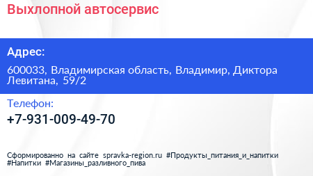 Выхлопной, автосервис по адресу 600033, Владимирская область, Владимир, Диктора Левитана, 59/2 в дальнейшем Организация, размещена в следующих категориях:
