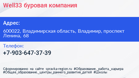 Well33, буровая компания по адресу 600022, Владимирская область, Владимир, проспект Ленина, 68 в дальнейшем Организация, размещена в следующих категориях: