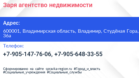 Заря, агентство недвижимости по адресу 600001, Владимирская область, Владимир, Студёная Гора, 36а в дальнейшем Организация, размещена в следующих категориях: