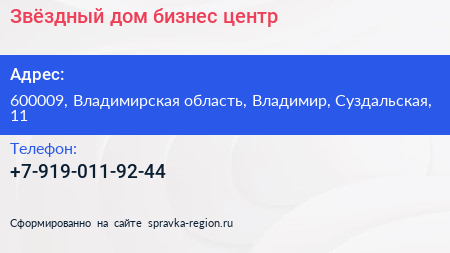 Звёздный дом, бизнес-центр по адресу 600009, Владимирская область, Владимир, Суздальская, 11 в дальнейшем Организация, размещена в следующих категориях: