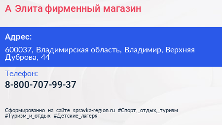 А-Элита, фирменный магазин по адресу 600037, Владимирская область, Владимир, Верхняя Дуброва, 44 в дальнейшем Организация, размещена в следующих категориях: