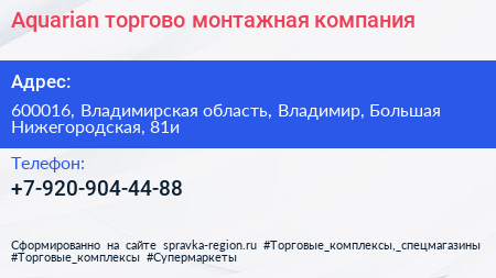 Aquarian, торгово-монтажная компания по адресу 600016, Владимирская область, Владимир, Большая Нижегородская, 81и в дальнейшем Организация, размещена в следующих категориях: