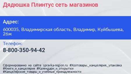 Дядюшка Плинтус, сеть магазинов по адресу 600035, Владимирская область, Владимир, Куйбышева, 26ж в дальнейшем Организация, размещена в следующих категориях: