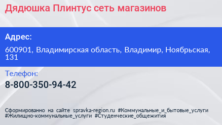 Дядюшка Плинтус, сеть магазинов по адресу 600901, Владимирская область, Владимир, Ноябрьская, 131 в дальнейшем Организация, размещена в следующих категориях: