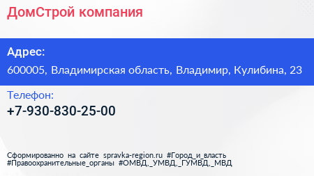 ДомСтрой, компания по адресу 600005, Владимирская область, Владимир, Кулибина, 23 в дальнейшем Организация, размещена в следующих категориях: