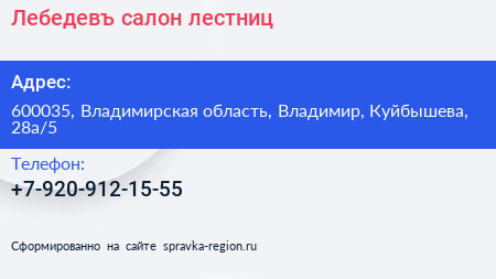 Лебедевъ, салон лестниц по адресу 600035, Владимирская область, Владимир, Куйбышева, 28а/5 в дальнейшем Организация, размещена в следующих категориях: