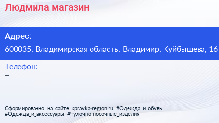 Людмила, магазин по адресу 600035, Владимирская область, Владимир, Куйбышева, 16 в дальнейшем Организация, размещена в следующих категориях: