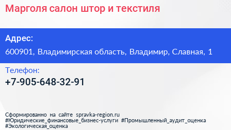 Марголя, салон штор и текстиля по адресу 600901, Владимирская область, Владимир, Славная, 1 в дальнейшем Организация, размещена в следующих категориях: