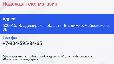 Надежда текс, магазин по адресу 600015, Владимирская область, Владимир, Чайковского, 3Б в дальнейшем Организация, размещена в следующих категориях: