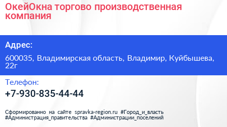 ОкейОкна, торгово-производственная компания по адресу 600035, Владимирская область, Владимир, Куйбышева, 22г в дальнейшем Организация, размещена в следующих категориях: