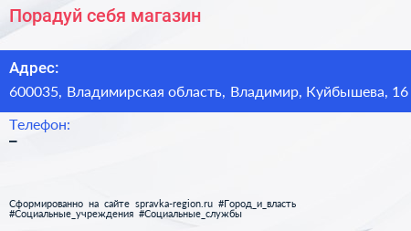Порадуй себя, магазин по адресу 600035, Владимирская область, Владимир, Куйбышева, 16 в дальнейшем Организация, размещена в следующих категориях: