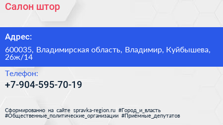 Салон штор по адресу 600035, Владимирская область, Владимир, Куйбышева, 26ж/14 в дальнейшем Организация, размещена в следующих категориях: