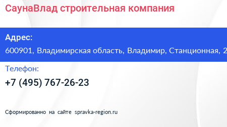 СаунаВлад, строительная компания по адресу 600901, Владимирская область, Владимир, Станционная, 2 в дальнейшем Организация, размещена в следующих категориях:
