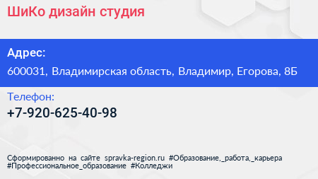 ШиКо, дизайн студия по адресу 600031, Владимирская область, Владимир, Егорова, 8Б в дальнейшем Организация, размещена в следующих категориях: