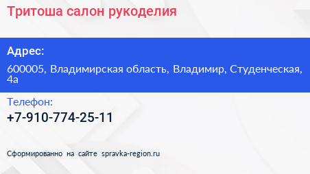 Тритоша, салон рукоделия по адресу 600005, Владимирская область, Владимир, Студенческая, 4а в дальнейшем Организация, размещена в следующих категориях: