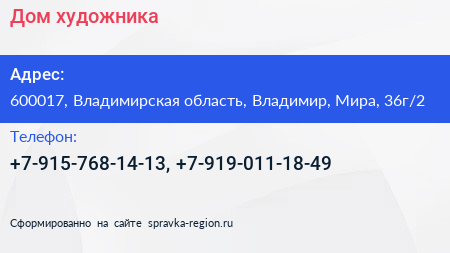 Дом художника по адресу 600017, Владимирская область, Владимир, Мира, 36г/2 в дальнейшем Организация, размещена в следующих категориях:
