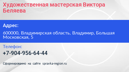 Художественная мастерская Виктора Беляева по адресу 600000, Владимирская область, Владимир, Большая Московская, 5 в дальнейшем Организация, размещена в следующих категориях: