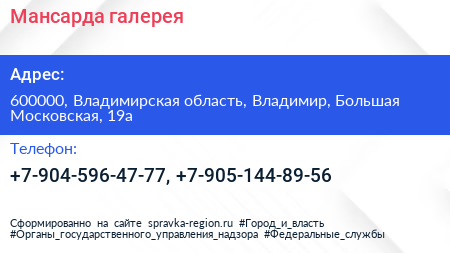 Мансарда, галерея по адресу 600000, Владимирская область, Владимир, Большая Московская, 19а в дальнейшем Организация, размещена в следующих категориях: