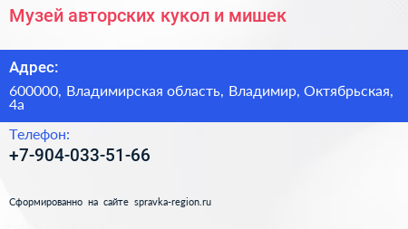 Музей авторских кукол и мишек по адресу 600000, Владимирская область, Владимир, Октябрьская, 4а в дальнейшем Организация, размещена в следующих категориях: