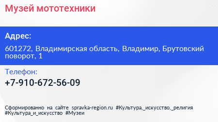 Музей мототехники по адресу 601272, Владимирская область, Владимир, Брутовский поворот, 1 в дальнейшем Организация, размещена в следующих категориях:
