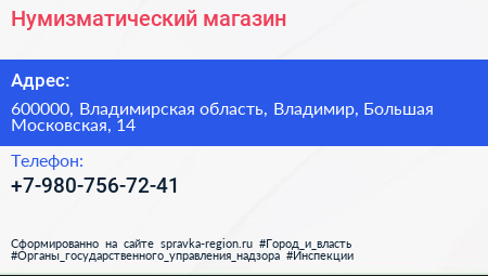 Нумизматический магазин по адресу 600000, Владимирская область, Владимир, Большая Московская, 14 в дальнейшем Организация, размещена в следующих категориях: