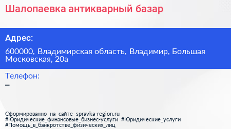 Шалопаевка, антикварный базар по адресу 600000, Владимирская область, Владимир, Большая Московская, 20а в дальнейшем Организация, размещена в следующих категориях: