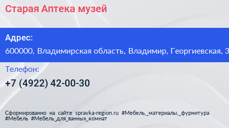 Старая Аптека, музей по адресу 600000, Владимирская область, Владимир, Георгиевская, 3 в дальнейшем Организация, размещена в следующих категориях: